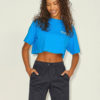 Блузка з бавовняного плетіння. Квадратний виріз горловини з прихованою гумкою та застібкою-замком з вузькими зав’язками спереду. Короткі пишні рукави з оборками, широкий шов на талії та розкльошена баска для чіткого силуету. Без підкладки