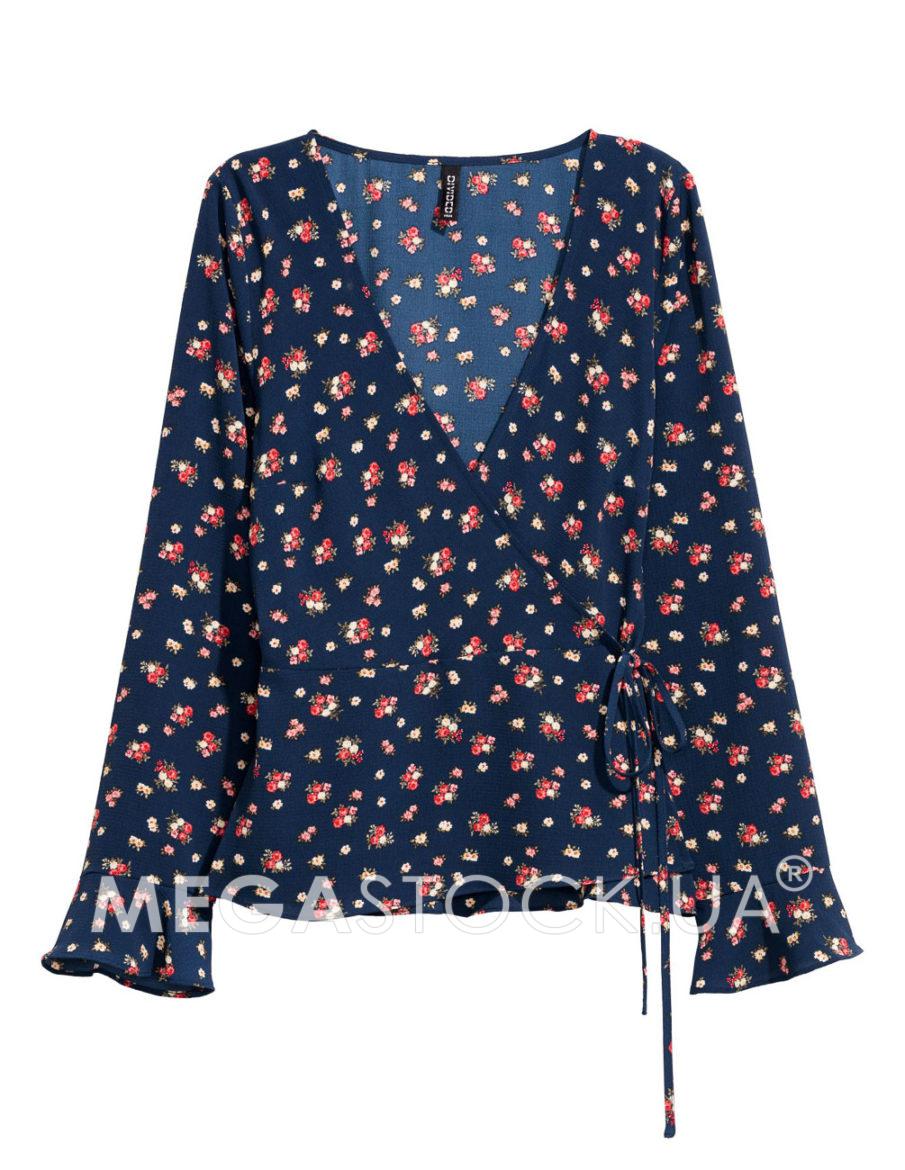 Блуза из креповой ткани с глубоким треугольным вырезом и запахом спереди с узкими завязками сбоку. Длинные рукава с оборкой снизу. Отрезная талия со слегка расклешенной баской.