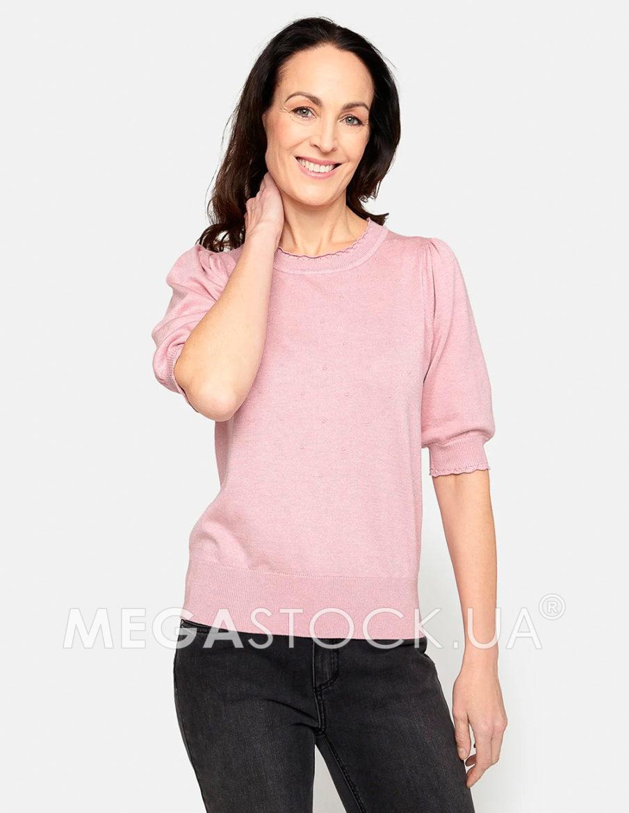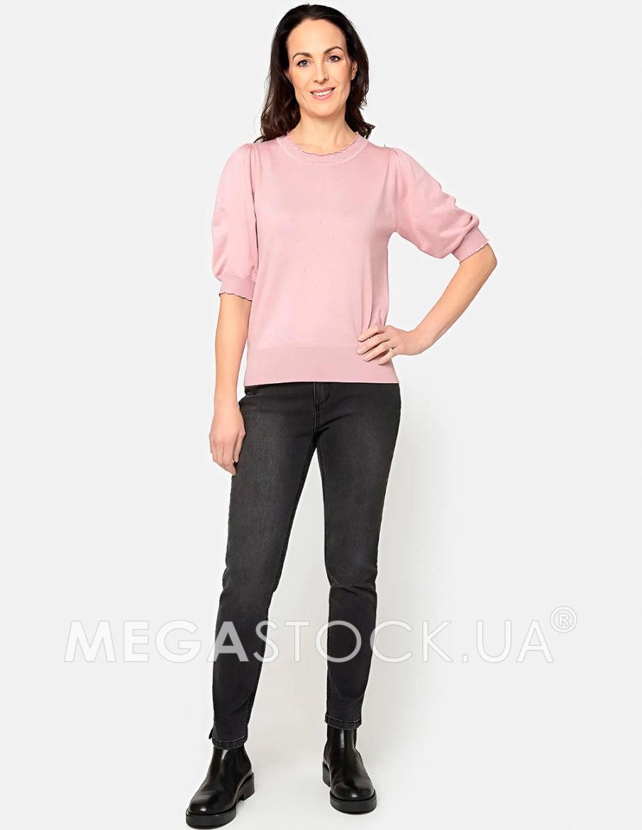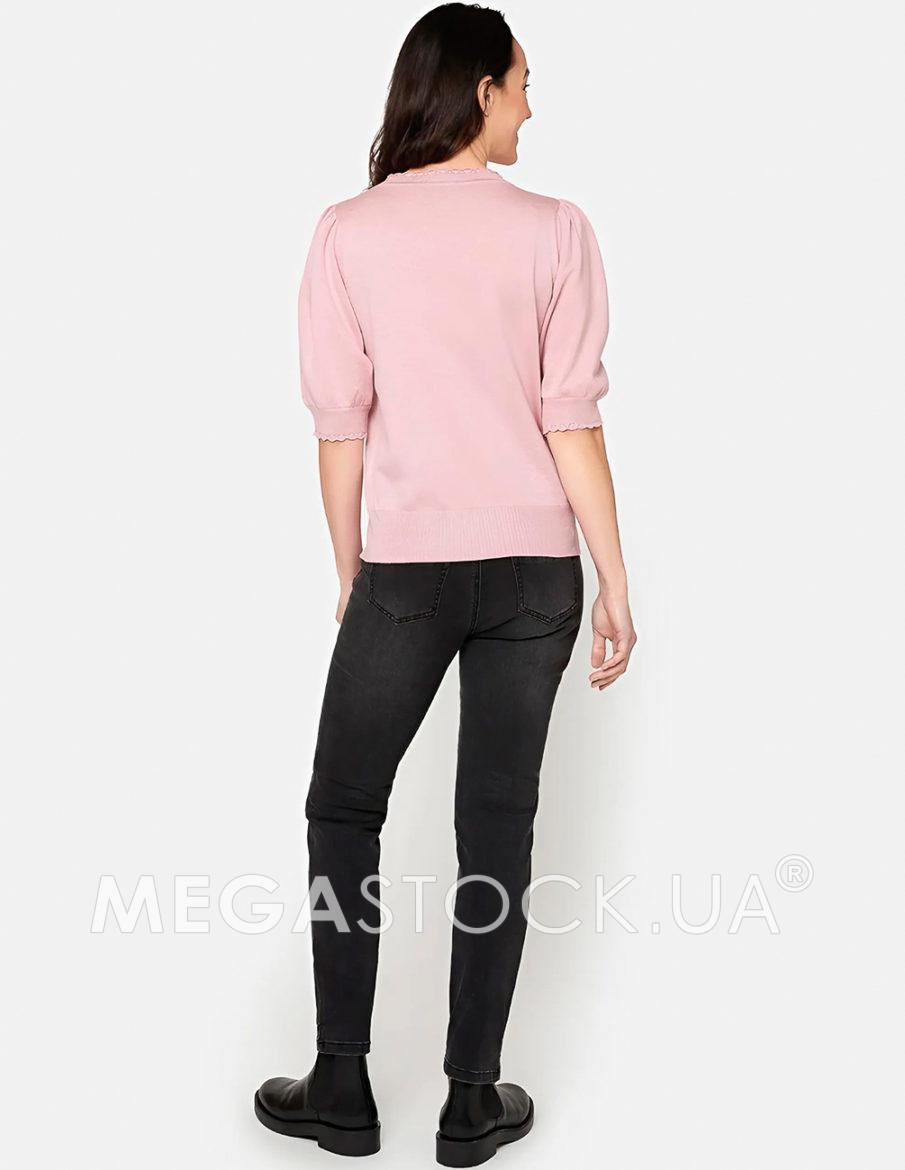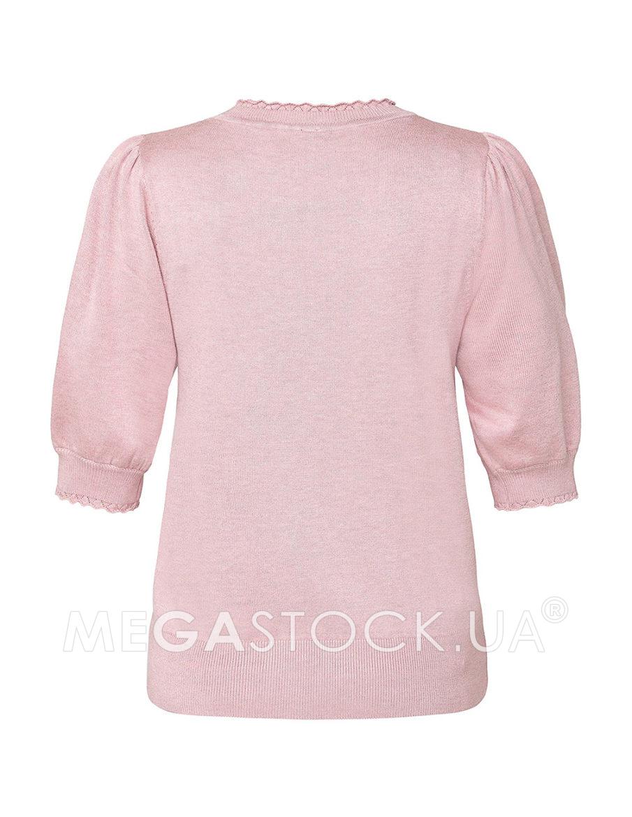 Футболка з круглим вирізом горловини із суміші віскози. Короткі рукава буфи та тонкі плетені крапки спереду. Окантовка в рубчик із тонким мереживом на горловині та рукавах