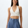Укорочена кофта з ніжного трикотажу в рубчику з короткими рукавами. V-подібний виріз горловини, застібається на один гудзик, гофровані краї