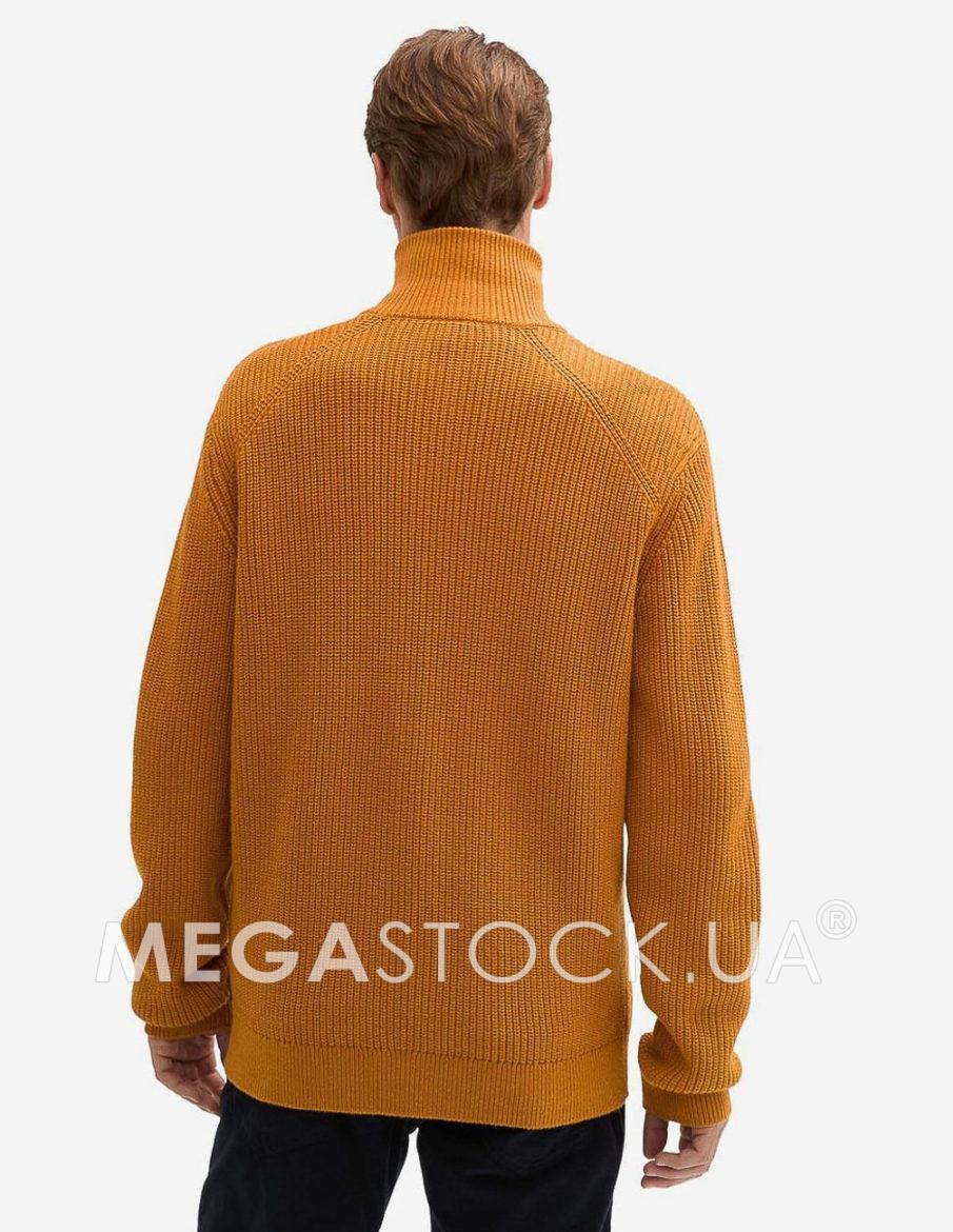Кофта із крупної пряжі суміші бавовни та поліестеру. Високий комір горловини, спереду застібається на блискавку