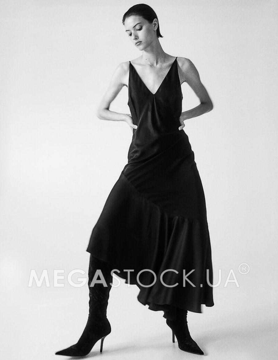 Приталена сукня до щиколотки з віскозної тканини. Надзвичайно вузькі бретелі, глибокий V-подібний виріз спереду та ззаду, а також спідниця із заокругленим швом для драпірованого ефекту. Асиметричний поділ. Без підкладки