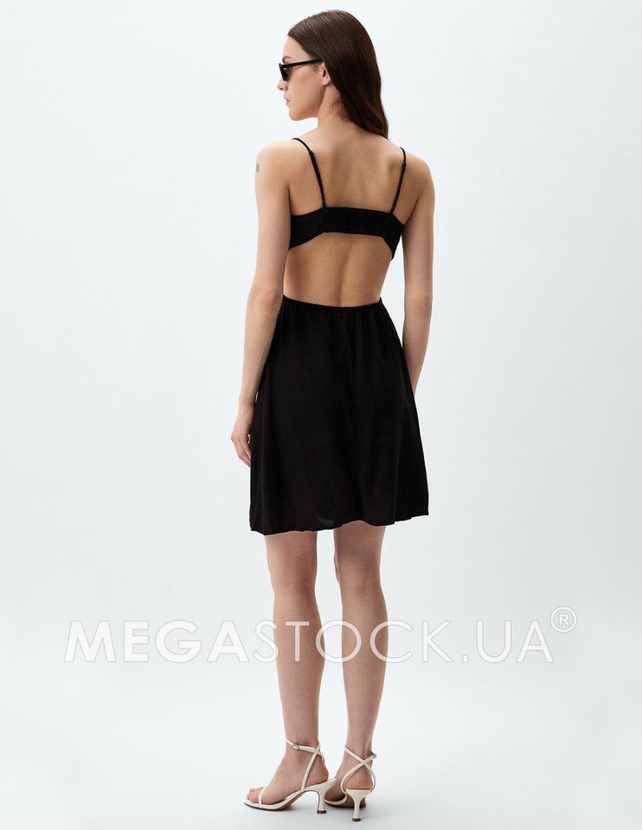 Коротка сукня без рукавів з віскозної тканини. Вузькі регульовані бретелі, V-подібний виріз горловини та відкрита частина спереду з вузькою зав’язкою на потилиці. Ліф з облямівкою ззаду, відкриті частини з боків та ззаду, а також кругла спідниця з закритою гумкою зверху. Без підкладки