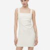 Коротка сукня з тканої тканини з глибоким V-подібним вирізом і прихованою застібкою на гачки спереду. Широкі рукави до ліктя, еластичний шов на талії та вшита спідниця-халат. Без підкладки