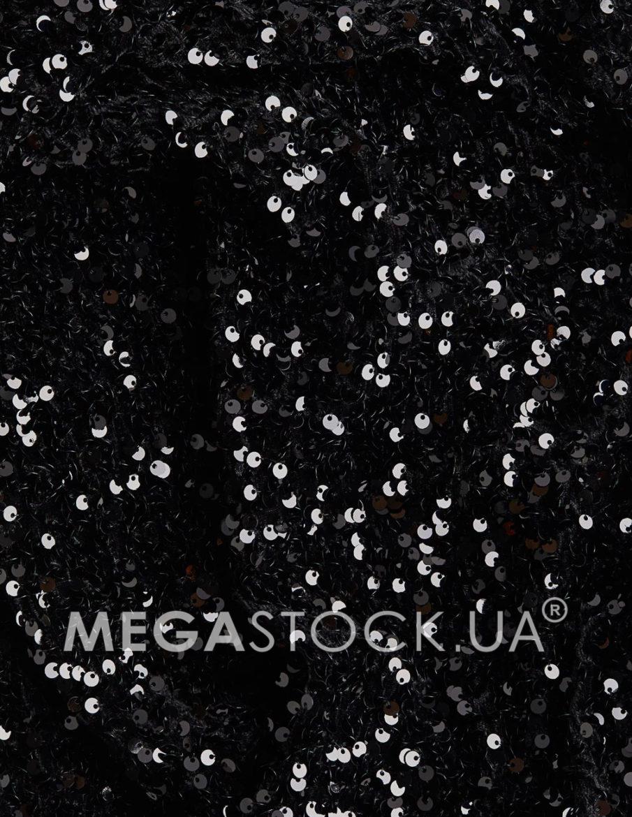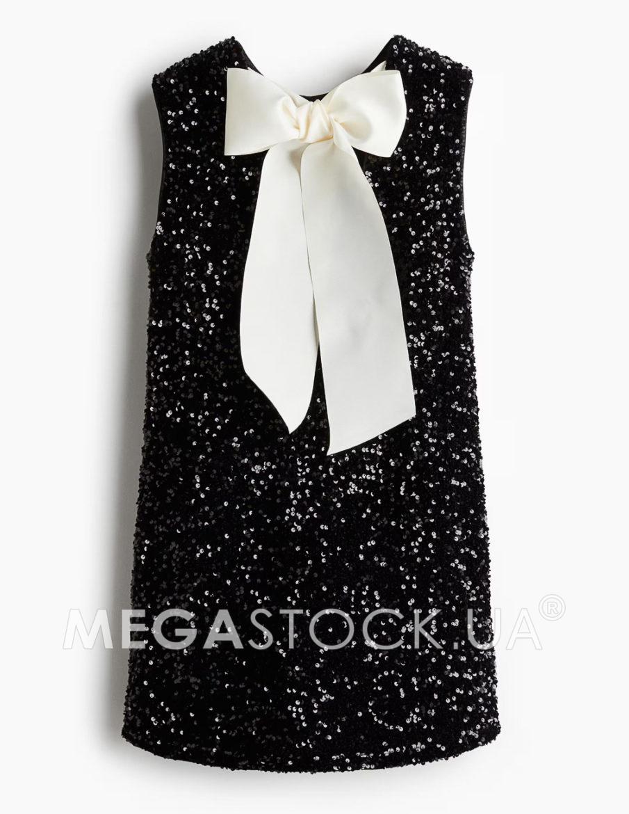 Коротка сукня без рукавів з блискітками на трикотажі. Вільного крою з круглим вирізом горловини та глибоким V-подібним вирізом ззаду з широкими стрічками з грогрену, що зав’язуються на потилиці