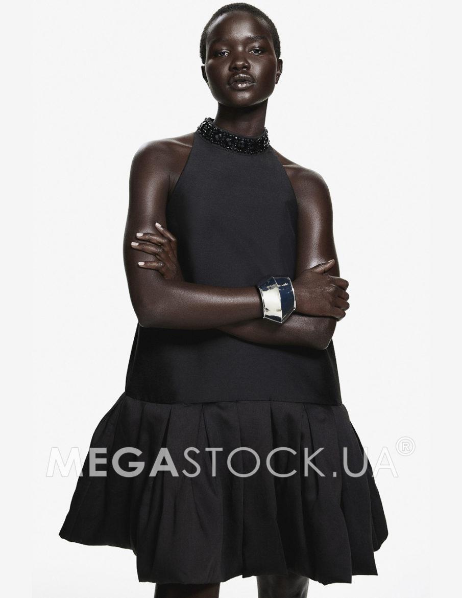Коротка сукня без рукавів з тканої тканини з вузьким вирізом зверху, коміром-стійкою, оздобленим намистинами, та розрізом у формі замкової щілини з прихованими кнопками ззаду. Вільний крій з двошаровою спідницею зі складками-коробочками для додаткового об’єму. На підкладці