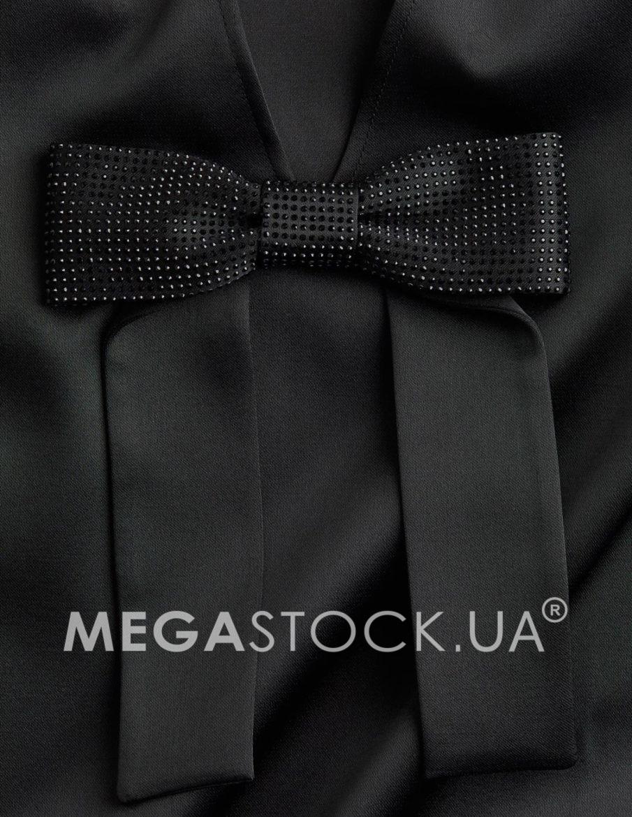Коротка сукня А-силуету без рукавів з тканої тканини. Круглий виріз горловини, виточки на грудях та глибокий виріз у формі букви V з декоративним бантом. Без підкладки