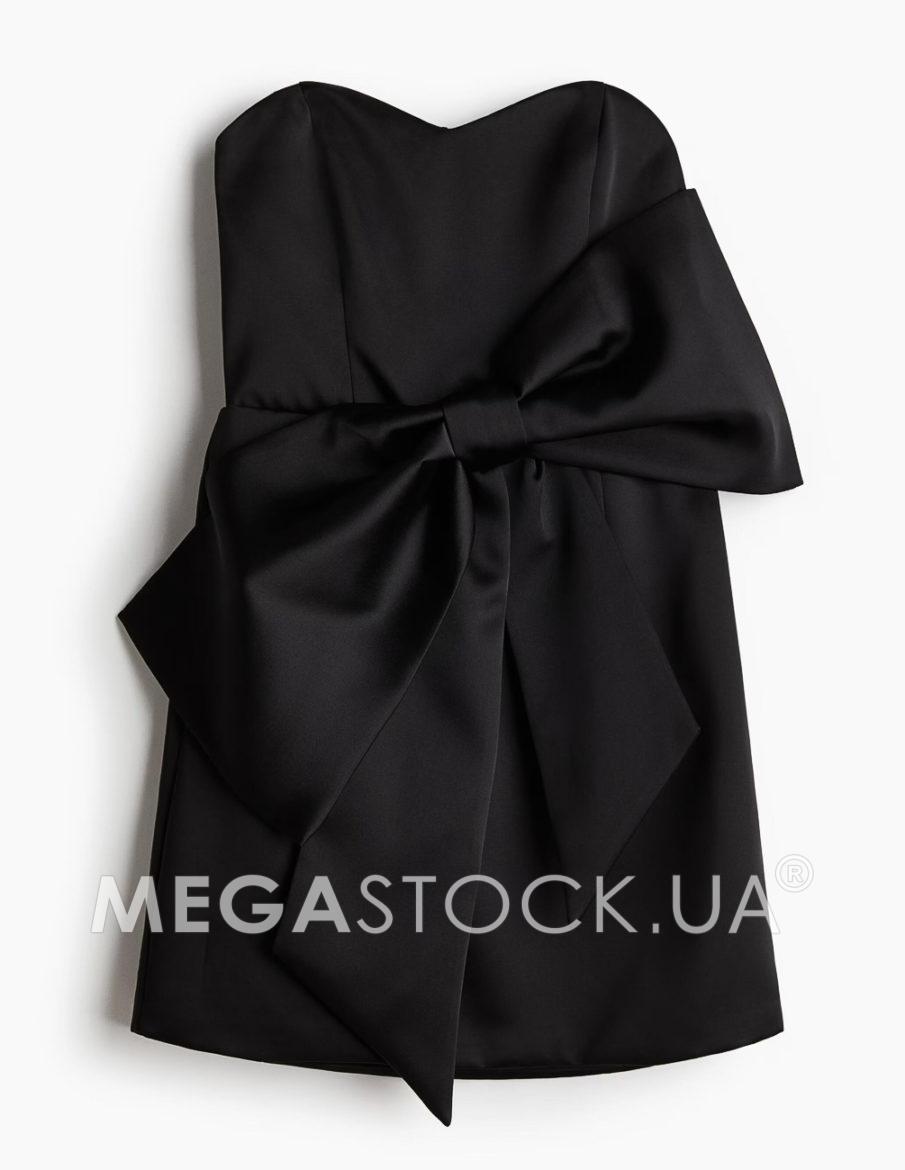 Коротка, облягаюча сукня-бандо з блискучого атласу з об’ємним бантом спереду. Виріз горловини у формі серця з прихованою силіконовою обробкою зверху, яка фіксує сукню. Прихована застібка-блискавка та гачок з одного боку, а також обшитий край ззаду. Атласова підкладка