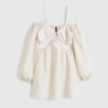 Коротка, приталена сукня з щільного трикотажу. Вузькі бретелі, виріз горловини-човник та декоративний бантик спереду. Прихована блискавка ззаду