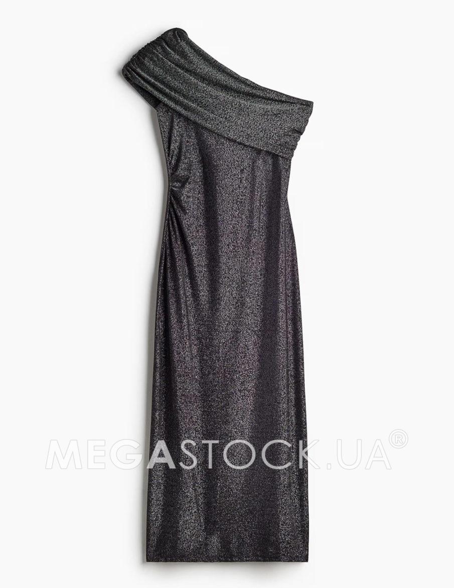 Приталена сукня з трикотажу з асиметричним вирізом на одне плече, широкою драпірованою складкою зверху та зібраним швом з одного боку талії для привабливого силуету