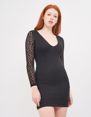 Коротка, приталена сукня з м’якого трикотажу з круглим вирізом горловини та застібкою-щільцею з прихованою ґудзиком ззаду на горловині. Тонкі підплічники, довгі рукави та вузол з одного боку талії для м’якого драпірування
