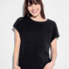 Коротка, приталена сукня з м’якого трикотажу з круглим вирізом горловини та застібкою-щільцею з прихованою ґудзиком ззаду на горловині. Тонкі підплічники, довгі рукави та вузол з одного боку талії для м’якого драпірування