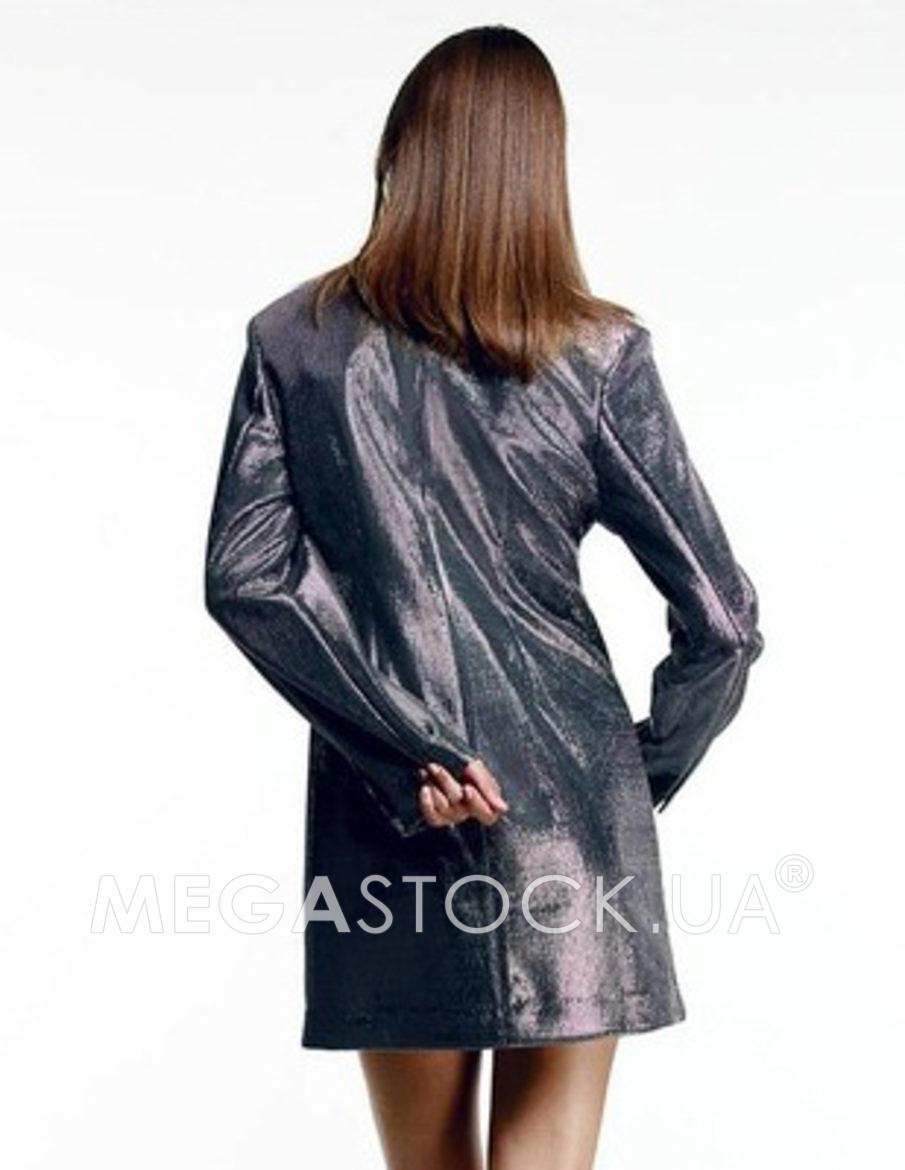 Коротка сукня з блискучого трикотажу. Круглий виріз горловини, формуючі виточки спереду та ззаду для чіткого силуету, а також прихована блискавка ззаду. Плечові накладки та довгі рукави. На підкладці