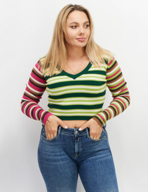 Короткий светр з м’якої в’язки в ребристу тканину з відкритим коміром, плавно спущеними плечима та довгими рукавами. Ребристі манжети та низ