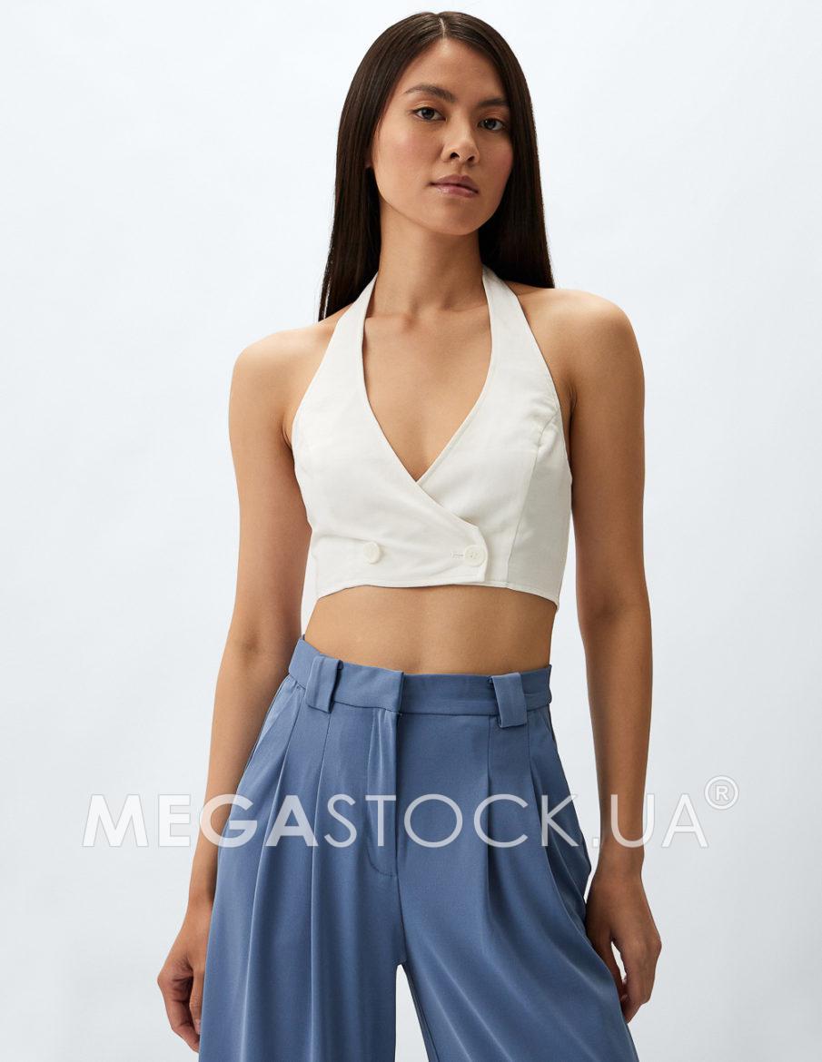 Укорочений топ з тканої тканини з коміром-халтерном у стилі жилета. V-подібний виріз та вшитий запах з декоративними ґудзиками спереду. Фліс ззаду та ґудзики ззаду на горловині. На підкладці