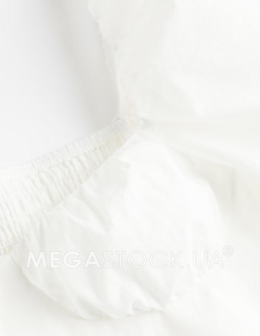Топ з бавовняного попліну з вирізом «сердечко», фігурними чашечками та короткими пишними рукавами. Вузька гумка на плечах і манжетах. Облямівка ззаду. Частково на підкладці