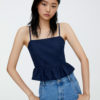 Жилет без рукавів із бавовняного деніму. Комір з куточками, застібається на гудзики. Дві нагрудні кишені з клапаном, ззаду кокетка